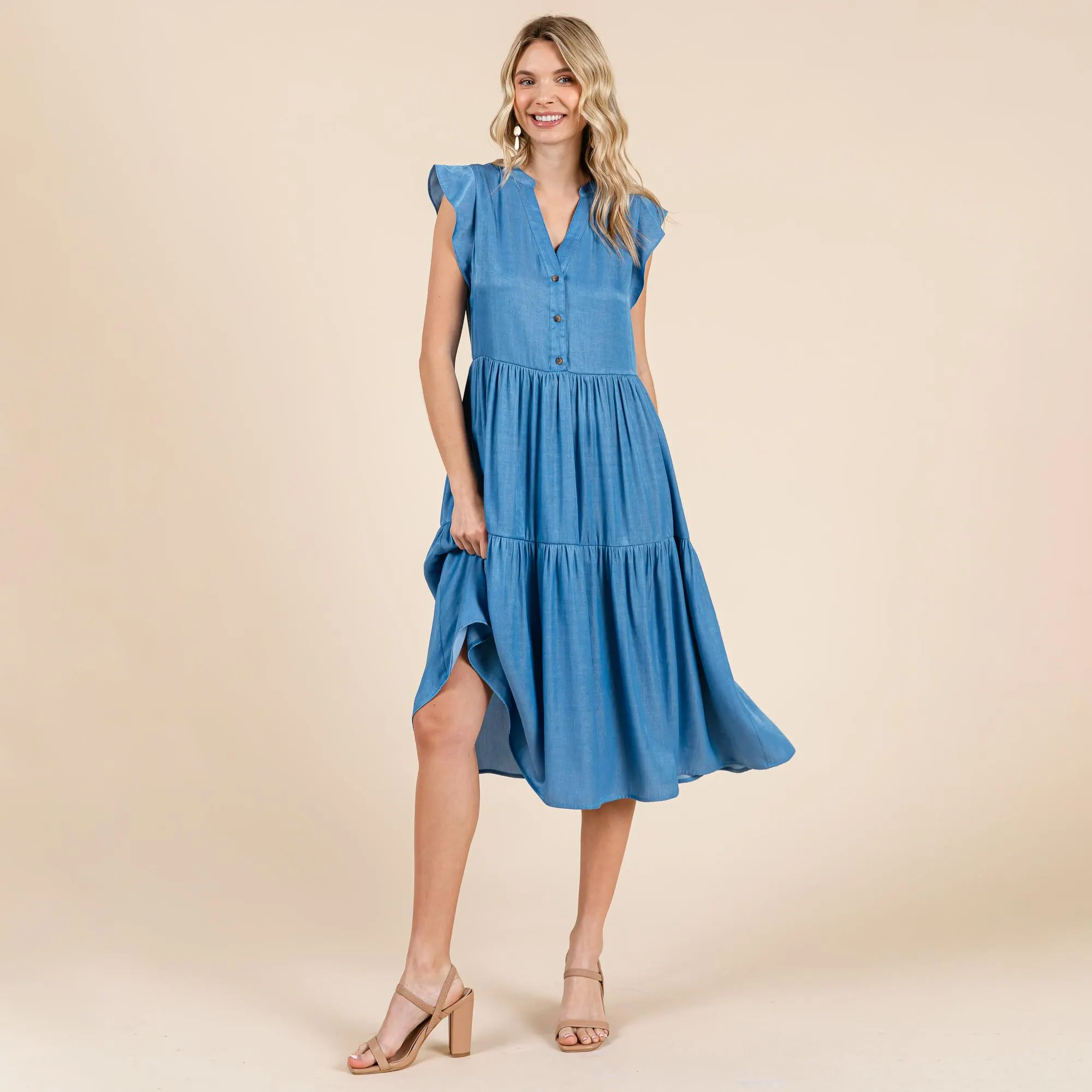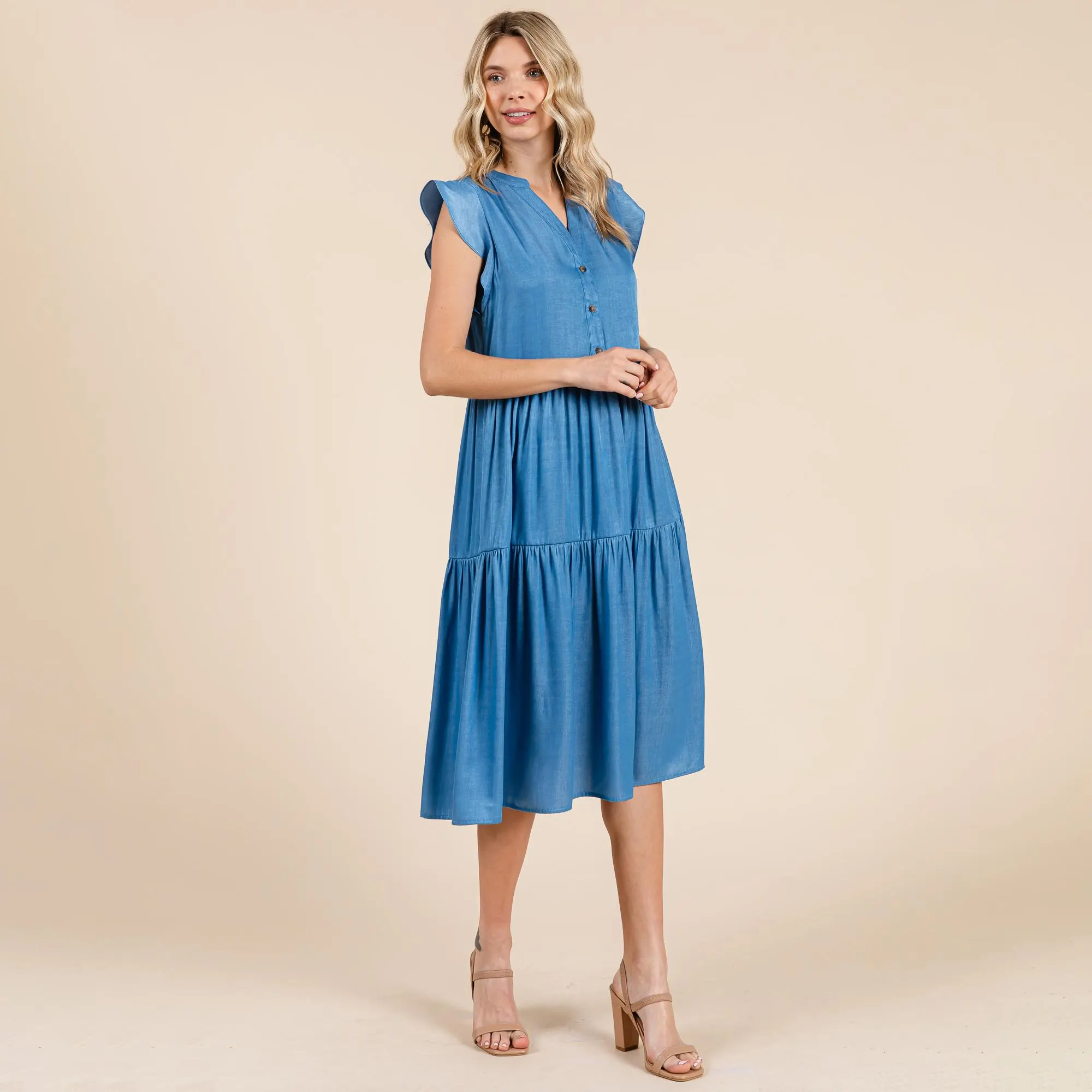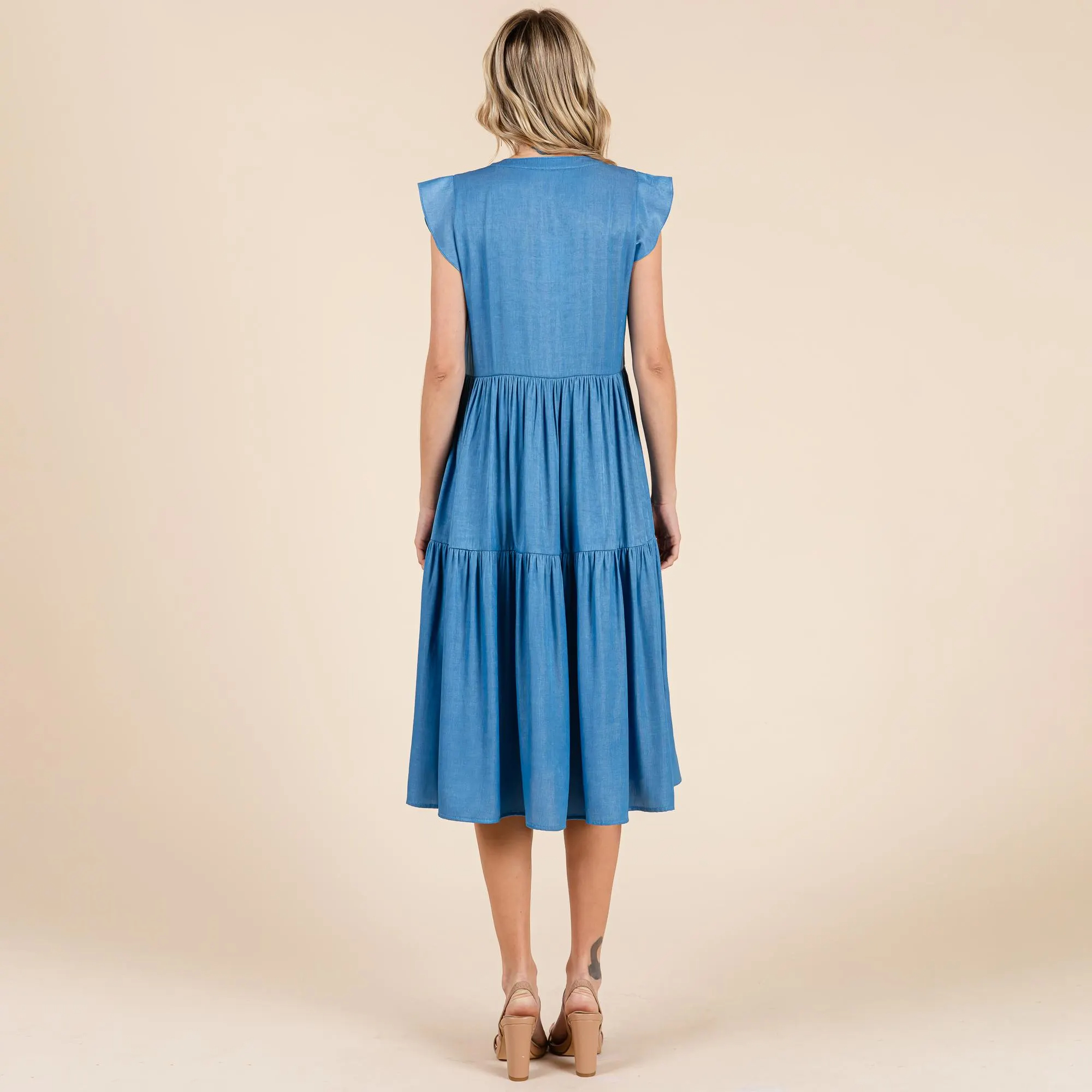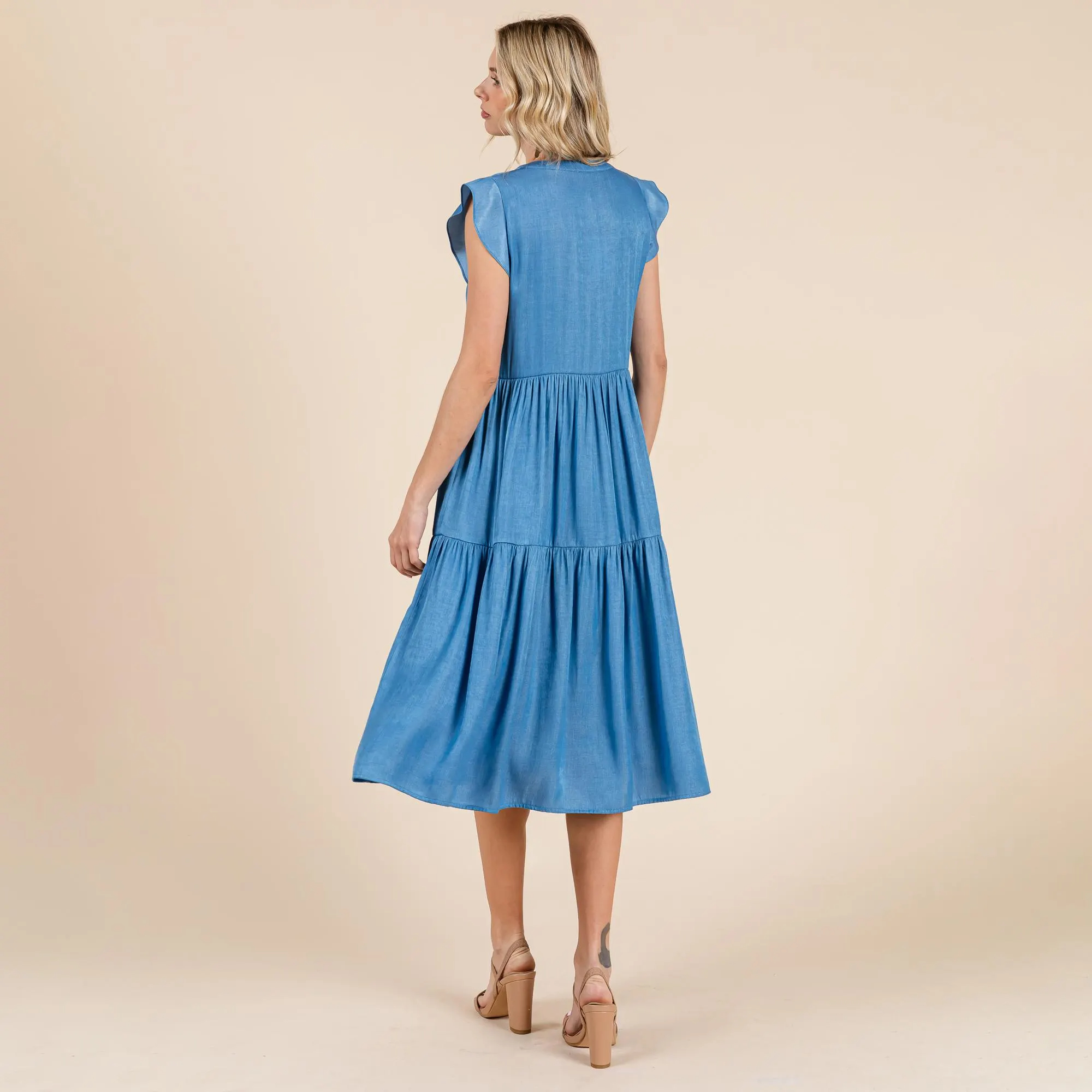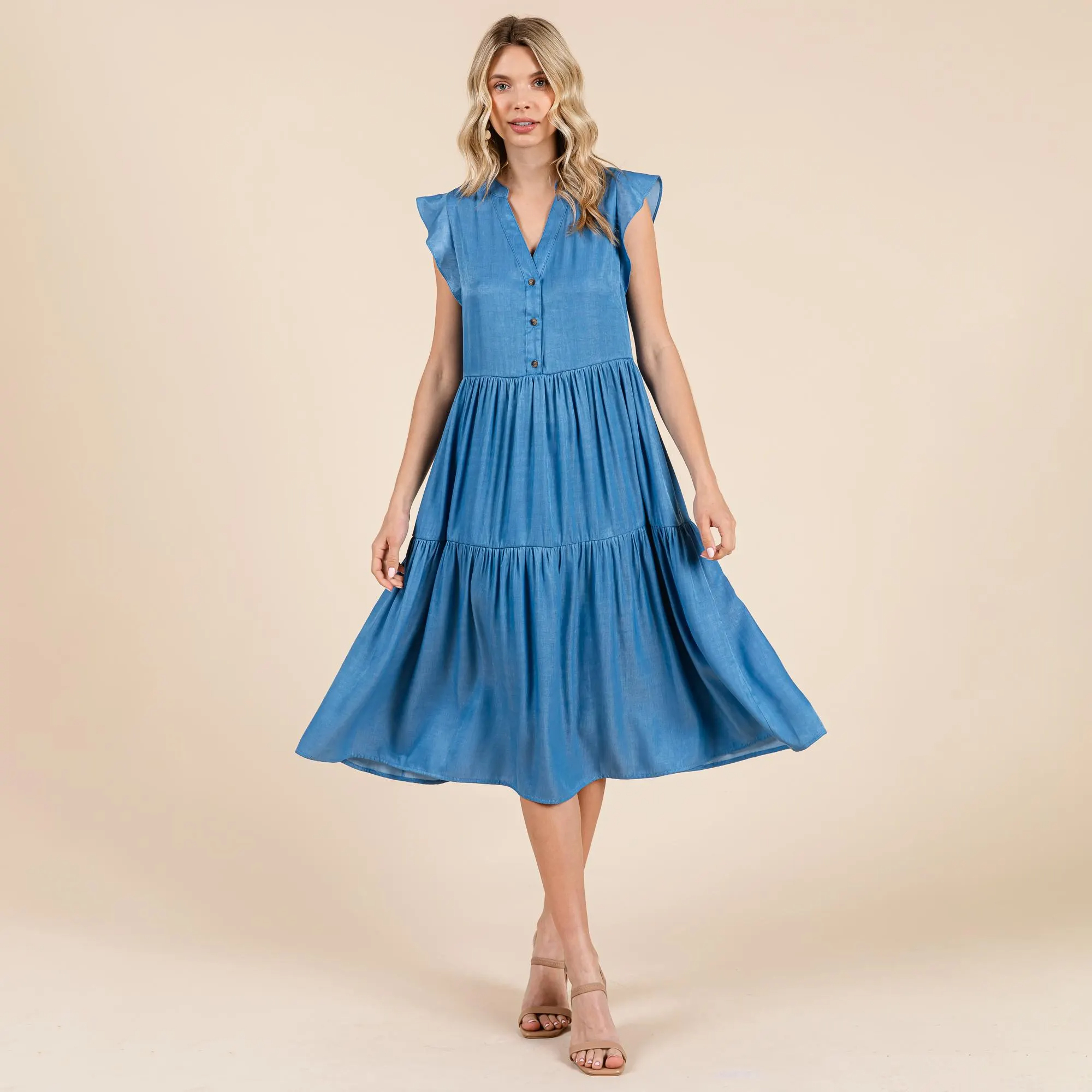 Made from a blend of viscose and nylon/polyester fabric that mimics denim’s drape, this dress offers three key benefits: