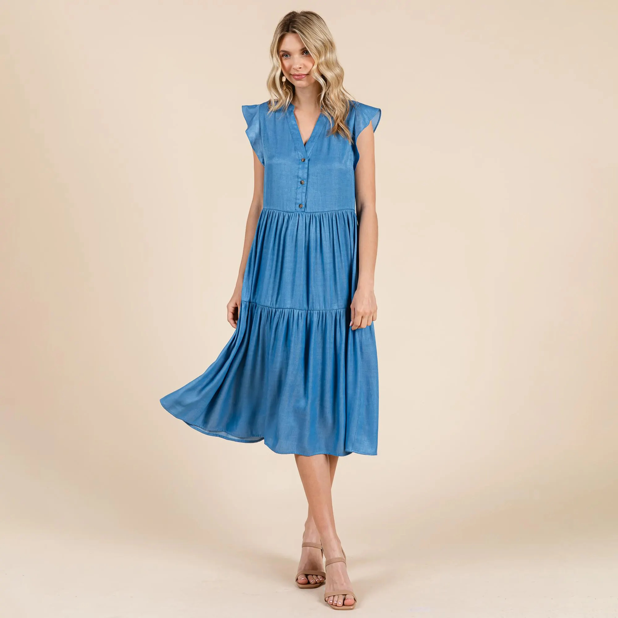 For a vacation vibe: Pair this with a wide-brimmed straw hat and flip-flops for a stroll by the beach or in a small town. The denim blue and natural scenery create a relaxing vacation vibe, making any photo a hit.